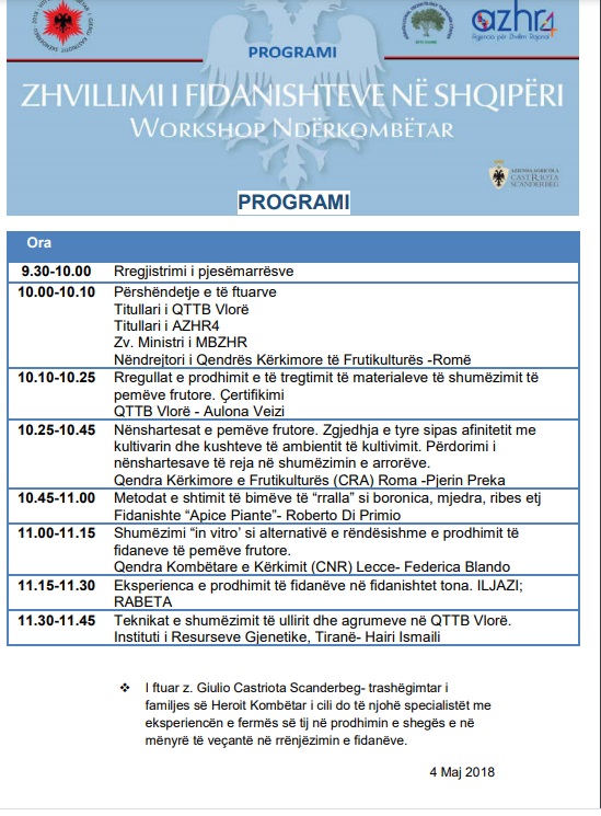 Në kuadrin e bashkëpunimit institucional në punën e përbashkët për zhvillimin e potencialeve kryesore të territorit, Agjencia për Zhvillimin Rajonal 4 (AZHR4) dhe Qendra e Transferimit të Teknologjive Bujqësore (QTTB) kanë kënaqësinë t`ju ftojnë të merrni pjesë në Seminarin me temë: “Zhvillimi i Fidanishteve në Shqipëri”, më datë 04 Maj 2018, në sallën e konferencave të QTTB, Shamogjin Vlorë.